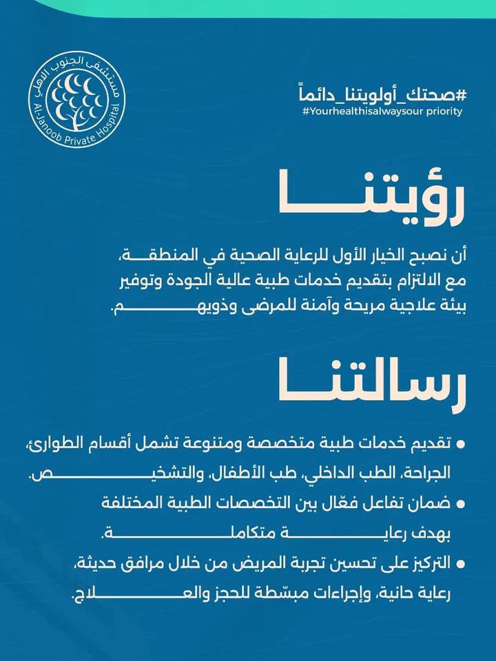 نحن في مستشفى الجنوب الأهلي نؤمن بأن الرعاية الصحية تبدأ من الإنسان. نُقدّم خدمات طبية متكاملة بأسلوب حديث، ونعمل بفريق من الأطباء والاستشاريين ذوي الخبرة لنضمن لكل مريض تجربة علاجية آمنة ومميزة. 👨‍⚕ فريقنا الطبي يضم نخبة من الاستشاريين والمتخصصين في مختلف المجالات الطبية، نختارهم بعناية لنضمن لكم التشخيص الدقيق والعلاج الأمثل.